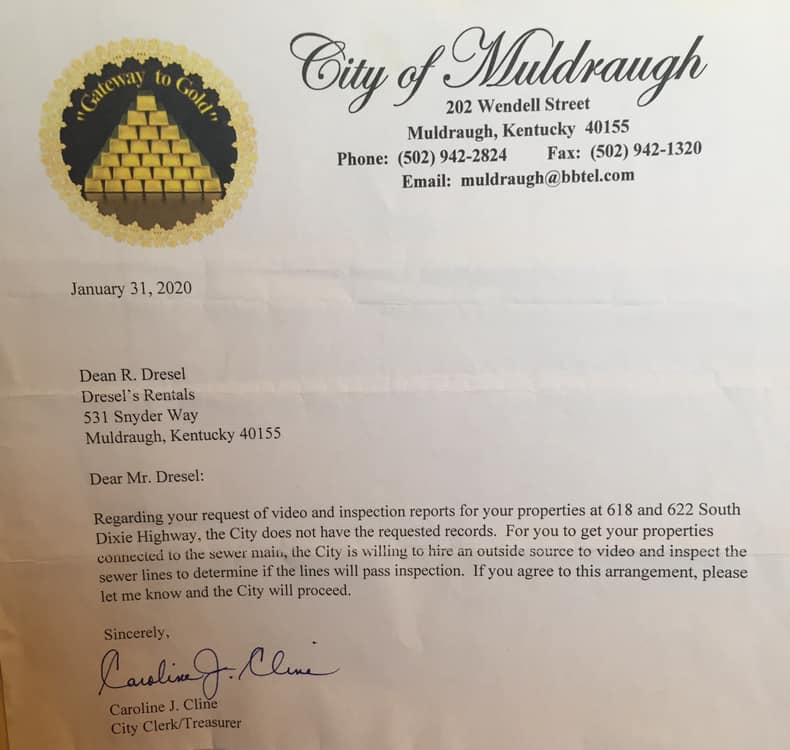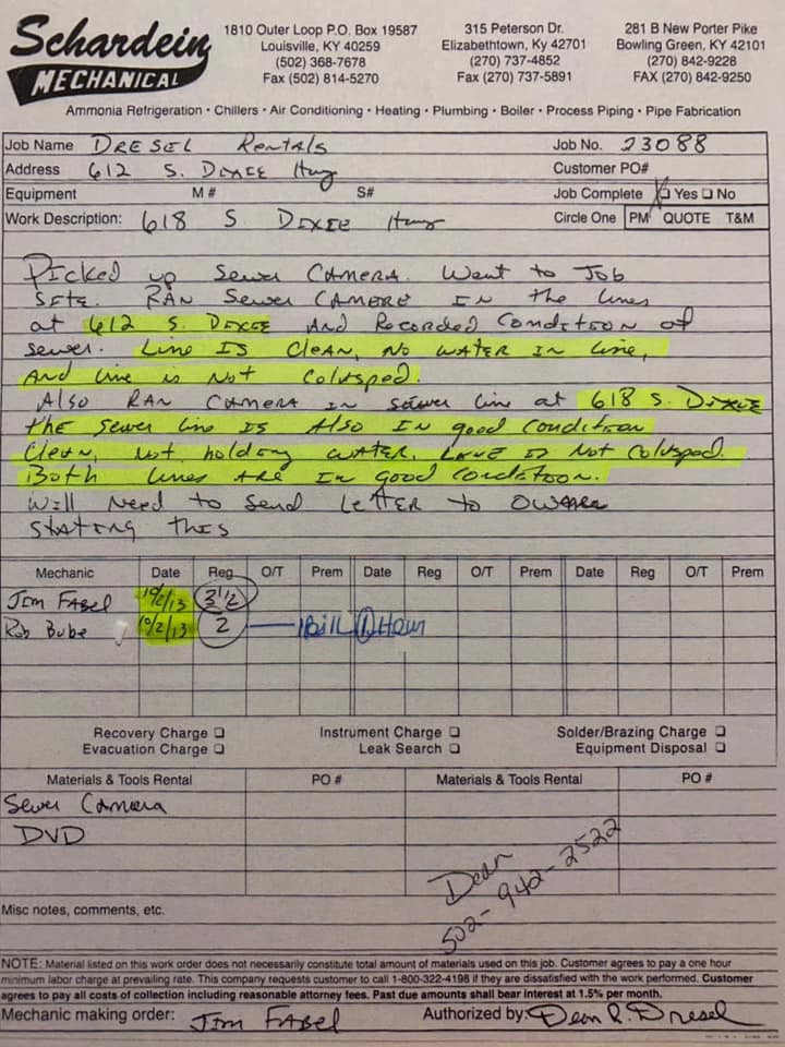 Along with the videos I posted a work order from the #1 plumbing company in the state of Kentucky Schardein Mechanical Who inspected the line stating; line is clean, no water in line, and line not collapsed. This was presented to the mayor and prior council as facts and they still refuse to do what’s right and reconnect the sewer line.
